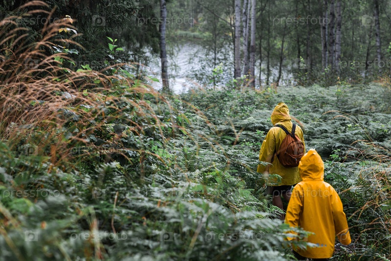 Туризм. пешком. Ладожские скары. Отец и сын туристов в желтых мантиях на каменных островах в лесу. Республика Карелия, Россия