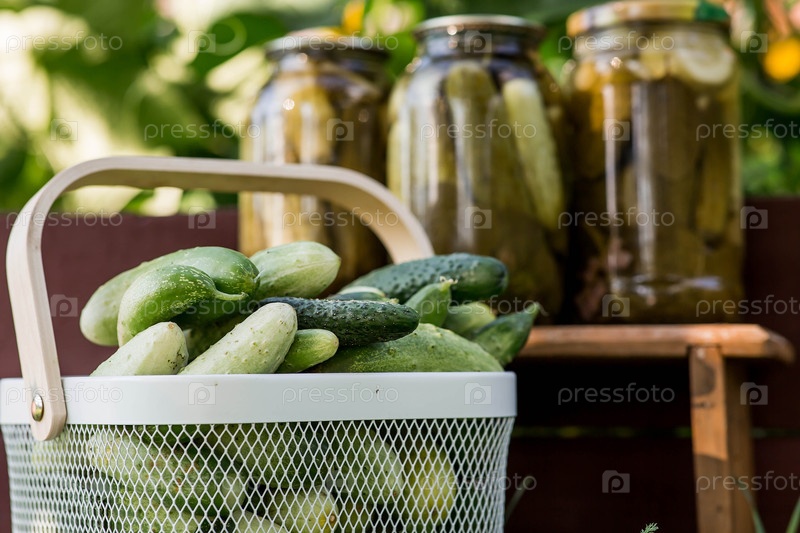 Свежие огурцы в корзине и хрустящие маринованные огурчики в прозрачной стеклянной банке. Огурцы с укропом и чесноком. Вкусные овощи из консервов. Огурцы на зиму