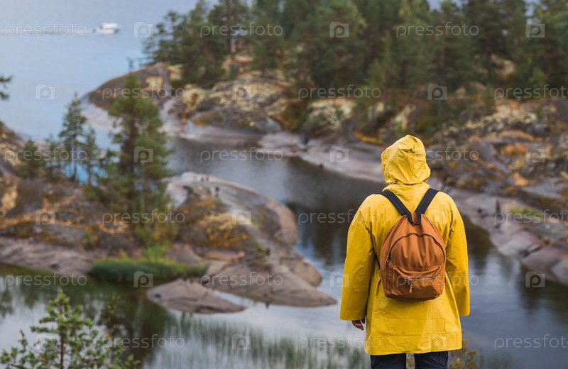Туризм. пешком. Ладожские скалы на Ладожском озере. Турист в желтом плаще с рюкзаком на каменистых островах смотрит издалека. Республика Карелия, Россия