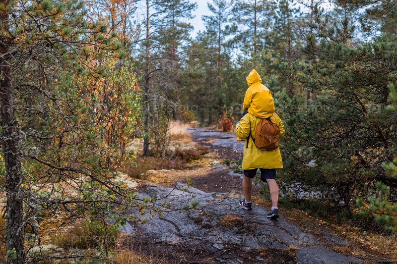 Туризм. пешком. Ладожские скары. Отец и сын туристов в желтых мантиях на каменных островах в лесу. Республика Карелия, Россия