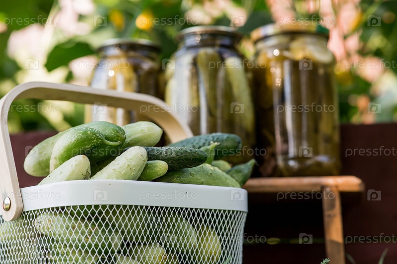 Свежие огурцы в корзине и хрустящие маринованные огурчики в прозрачной стеклянной банке. Огурцы с укропом и чесноком. Вкусные овощи из консервов. Огурцы на зиму