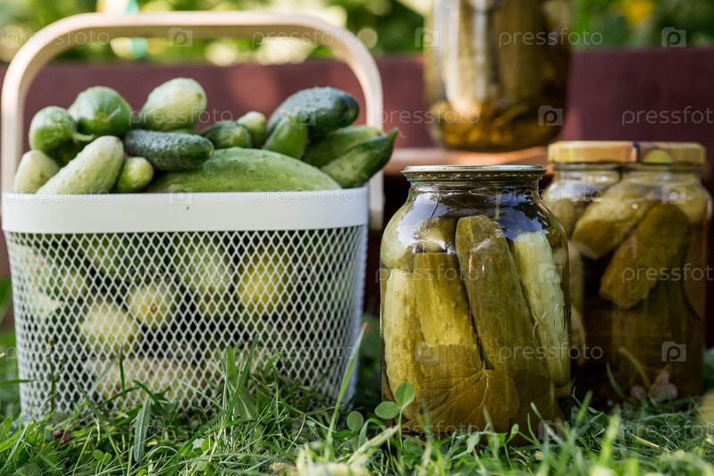 Свежие огурцы в корзине и хрустящие маринованные огурчики в прозрачной стеклянной банке. Огурцы с укропом и чесноком. Вкусные овощи из консервов. Огурцы на зиму