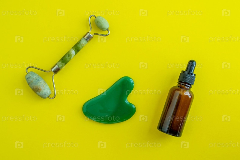 Бутылка для косметики и нефритовые массажеры на желтом фоне Салон красоты Фон с копией пробела