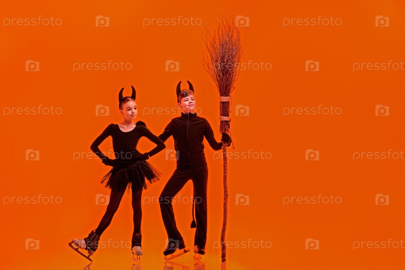 Молодые фигуристки выступают на льду в костюме дьявола Хэллоуина на ярко-оранжевом фоне