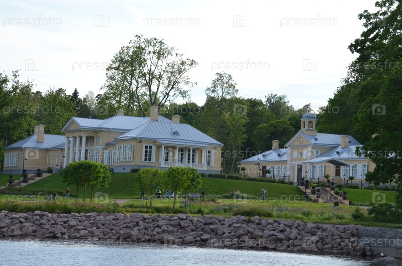 Вид с залива Защитный на Главном усадебном доме и крыле Библиотеки (стиль классицизма) в парке Монрепо в Выборге Ленинградской деревне