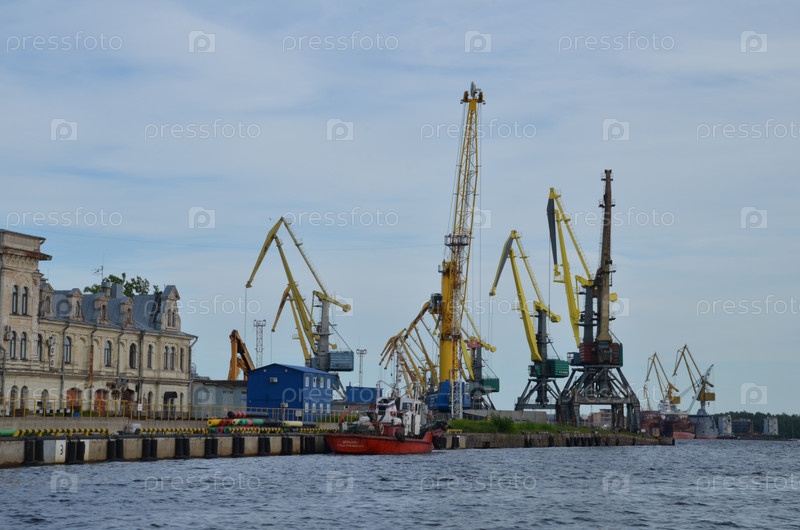 Вид на краны морского порта Выборга, Южной гавани и выборгской бухты города Выборга, Ленинградская область
