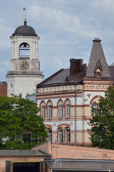 Вид на Часовую башню (здание 16-18 веков, колокольня) и исторические здания города Выборга, Дом консула Роте (педагогическая школа) в неоготическом стиле