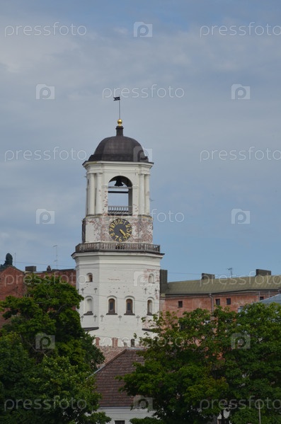Вид на Часовую башню (здание 16-18 веков, колокольня) и исторические здания города Выборга