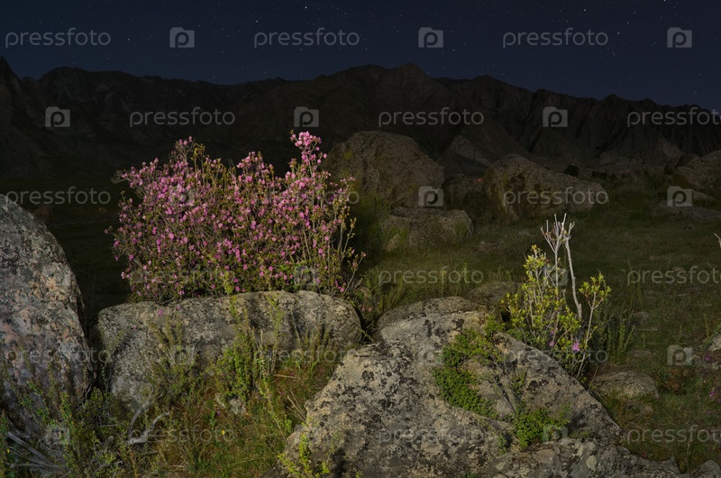 Юг Западной Сибири, Алтайские горы. Цветущие кустарники рододендрона Ledebour среди влажных камней в долине реки Катун в лунную ночь