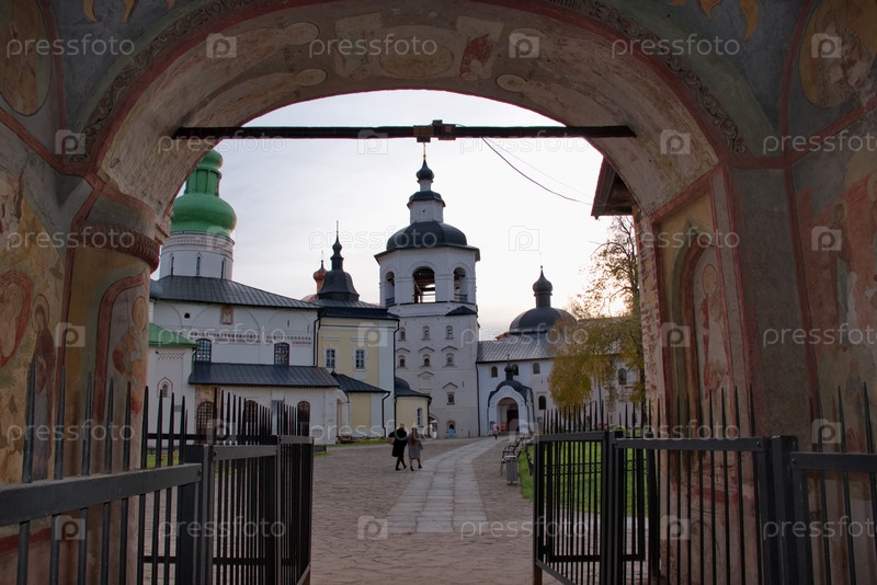 Россия.Вологдинская область.Октябрь 05, 2018.Православное украшение арки центрального входа в знаменитый Кирилло-Белозерский монастырь