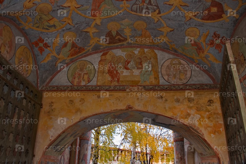 Россия.Вологдинская область.Октябрь 05, 2018.Православное украшение арки центрального входа в знаменитый Кирилло-Белозерский монастырь