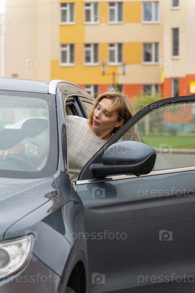 Молодая женщина с светло-коричневыми волосами в летнем платье открывает дверь современного внедорожника, припаркованного на солнечной городской улице
