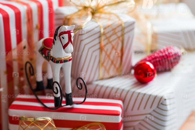 Стильные коробки с подарками и лошадь среди рождественской елки в домашнем интерьере гостиной. уютная концепция для рождественских праздников. мы готовим подарки для наших близких
