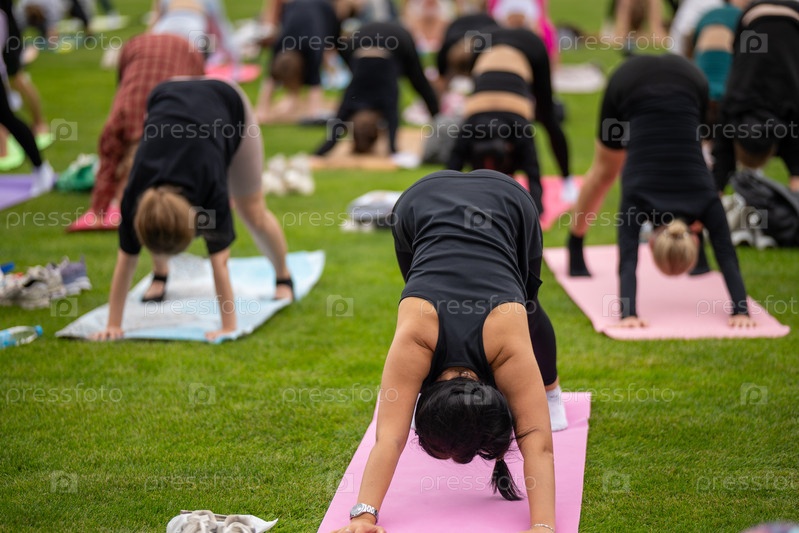 Групповое занятие йогой на газоне стадиона в стиле FYSM, неглубокая глубина поля с акцентом на одного практикующего