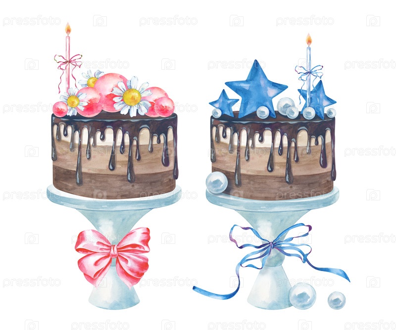 Два акварельных торта для детского душа, синий и розовый, нарисованы вручную.Акварельная иллюстрация выделена на белом фоне.Шаблон с праздничными десертами для мальчика и девочки