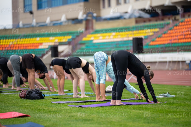 Групповое занятие йогой на газоне стадиона в стиле FYSM, неглубокая глубина поля с акцентом на одного практикующего