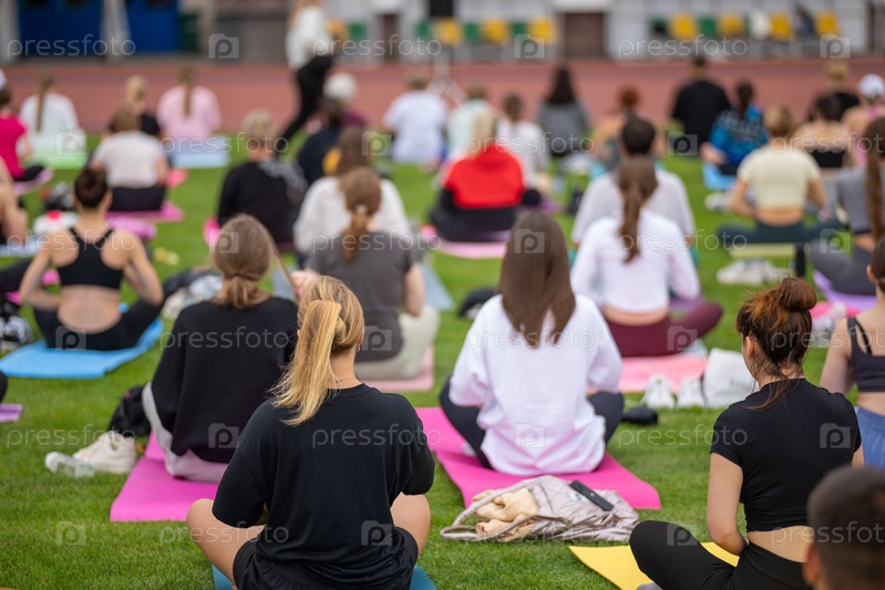 Групповое занятие йогой на газоне стадиона в стиле FYSM, неглубокая глубина поля с акцентом на одного практикующего