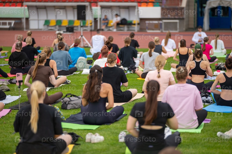 Групповое занятие йогой на газоне стадиона в стиле FYSM, неглубокая глубина поля с акцентом на одного практикующего