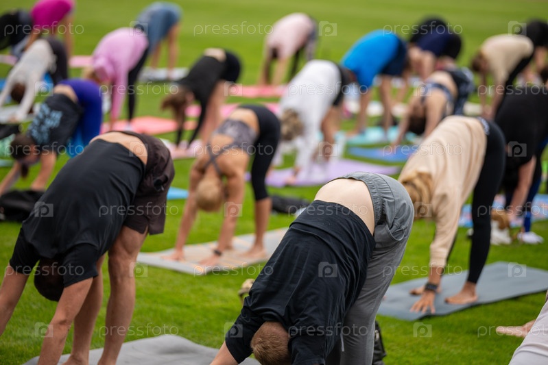 Групповое занятие йогой на газоне стадиона в стиле FYSM, неглубокая глубина поля с акцентом на одного практикующего