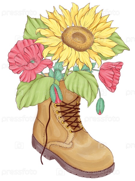 Декоративный сапог с цветами в нем, иллюстрация стиля акварели