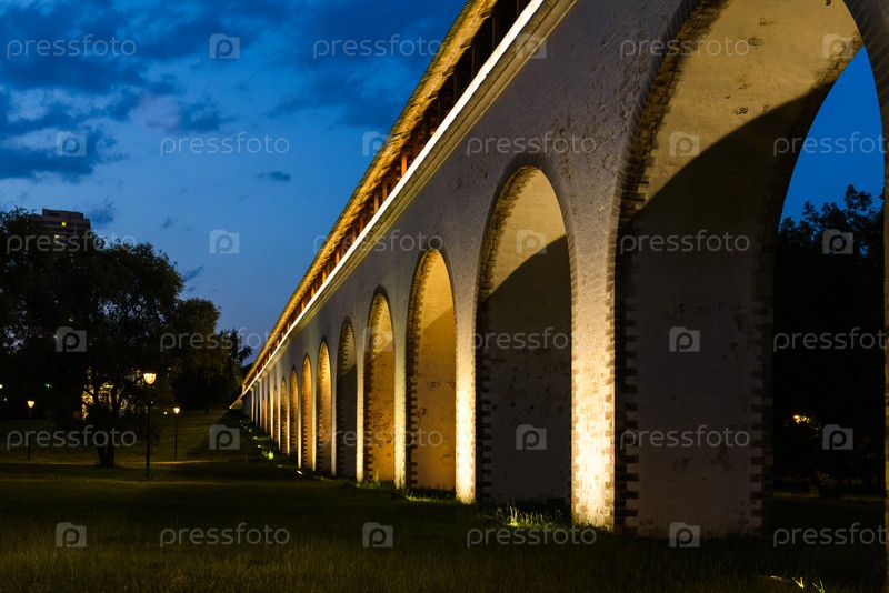Древний каменный акведук, освещенный ночью огнями под глубоким голубым небом. концепция исторической архитектуры для путешествий и истории . ,