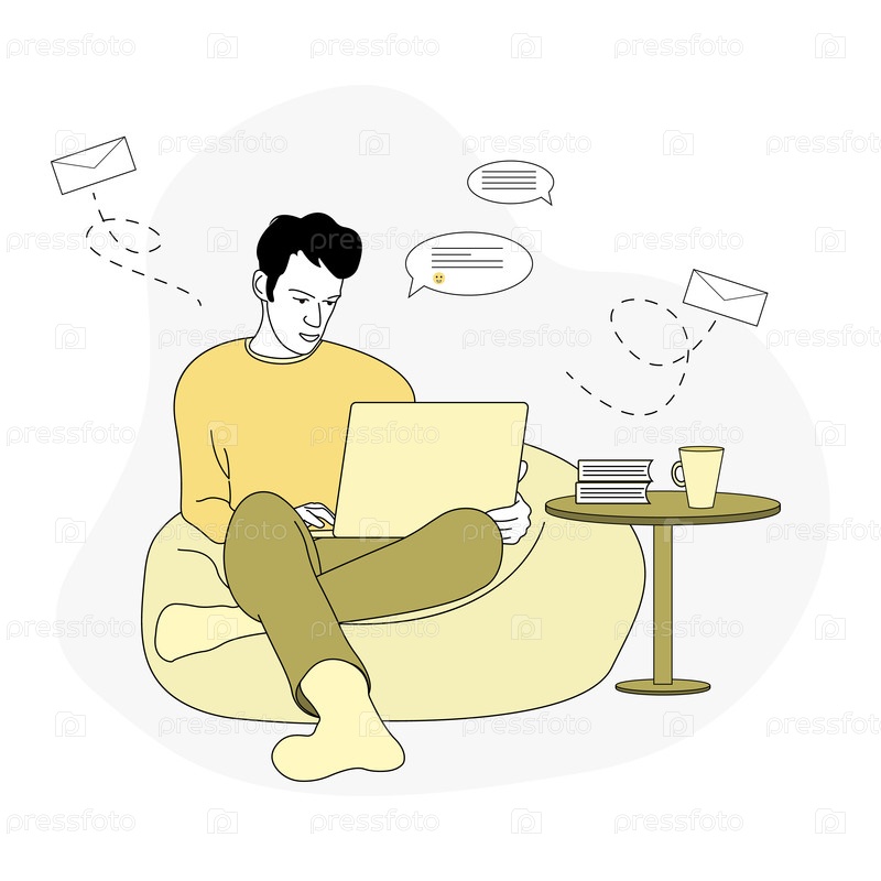 Мужчина в плоском стиле сидит на стуле и работает за компьютером