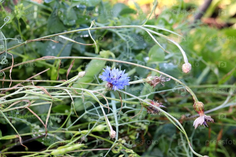 Голубой кукурузный цветок на фоне сухих цветов летом вечером в саду