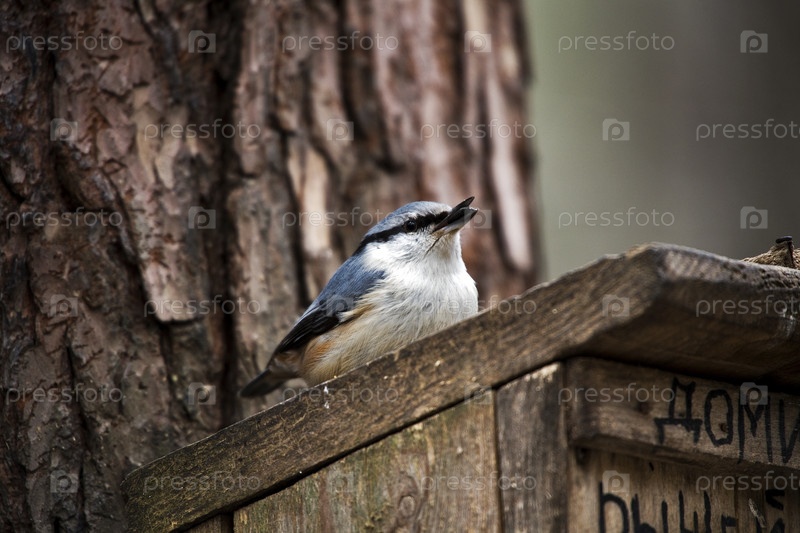 Небольшая птичка поползень в лесу на кормушке