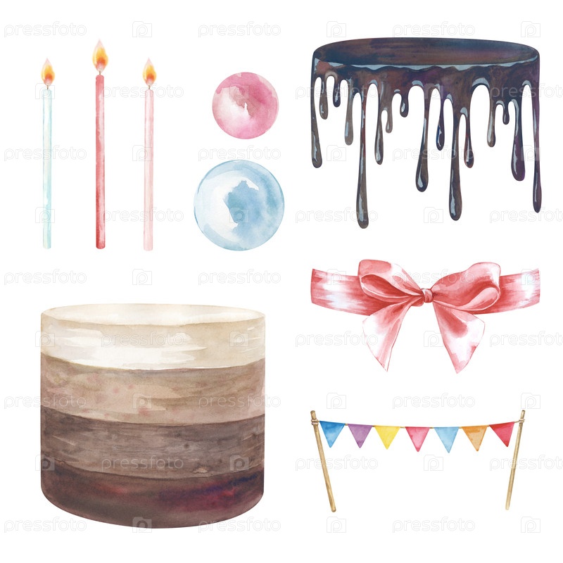 Набор с тортом и набором ручно нарисованных элементов для украшения торта. Иллюстрации акварели. Для меню, дизайна визитных карточек и упаковки