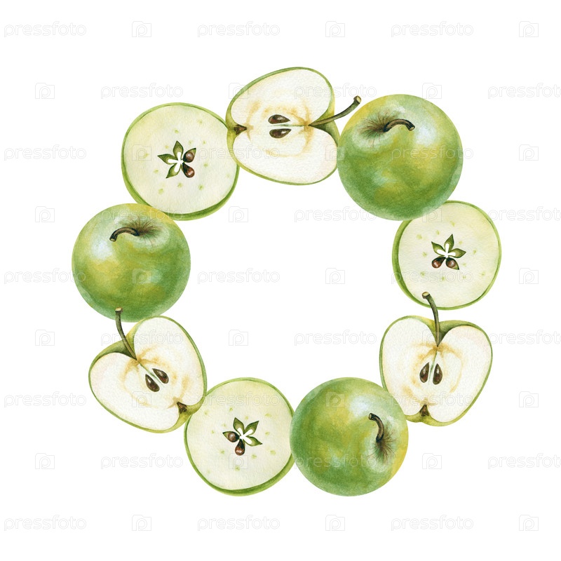 Круглый акварельный каркас зеленых яблок бабушки Смит. рукописная иллюстрация изолирована на белом фоне. шаблон с осенними фруктами для упаковки, меню, приглашений