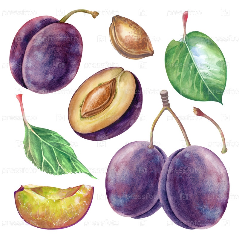 Акварель с сливами. Целые плоды и части слив, зеленые листья, семена и стебли. Ботаническая иллюстрация подчеркнута на белом фоне, подходящая для упаковки продуктов питания, кухонного декора и экологического стиля