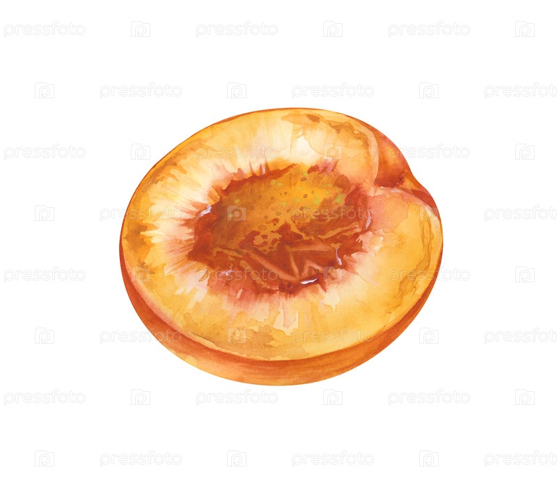 Половина персика, нарисованная вручную.Акварельная иллюстрация выделена на белом фоне.Ботанический рисунок куска спелого фрукта.Для дизайна линий плодов и здоровой пищи