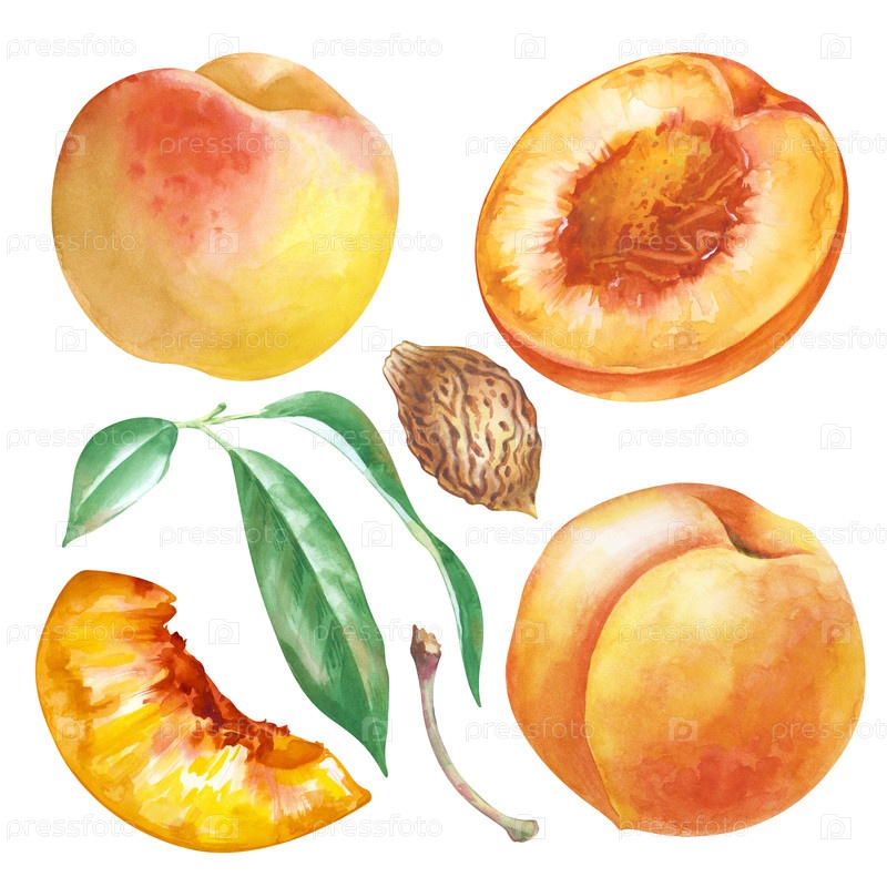 Акварель установлена с персиком, а его части покрашены вручную. Вытрите целые фрукты, половину персика, лом, камень, стебель и листья. Ботаническая иллюстрация. клипарт
