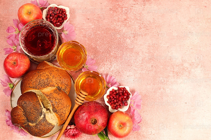 Концепция еврейского праздника Рош Хашаны с яблоками, медом, гранатом, цветами, красным вином и праздничным хулла-хлебом для поздравительной открытки, творческого оформления и шаблона для Еврейского Нового года