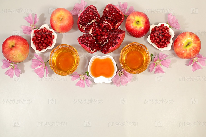Творческая осенняя композиция для еврейского праздника Рох Хашан. стилизация с символами Еврейского Нового года, шаблон с медом, яблоками, гранатом и цветами на рождественскую открытку, баннер