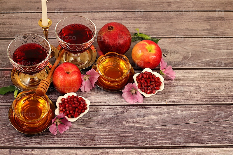 Концепция еврейского праздника Рош Хашаны с яблоками, медом, гранатом, цветами, красным вином и праздничным хулла-хлебом для поздравительной открытки, творческого оформления и шаблона для Еврейского Нового года