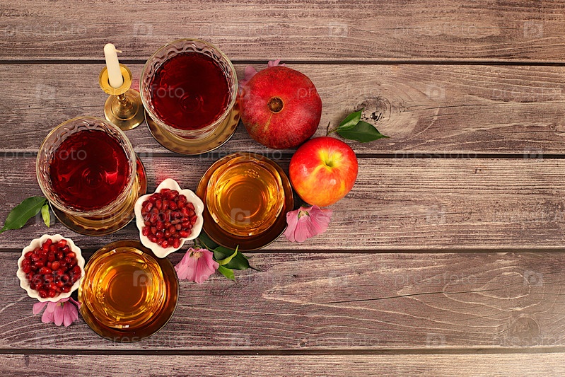Концепция еврейского праздника Рош Хашаны с яблоками, медом, гранатом, цветами, красным вином и праздничным хулла-хлебом для поздравительной открытки, творческого оформления и шаблона для Еврейского Нового года