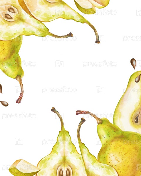 прямоугольная рама из ручной рисунки целых и ломтиков спелых груш. акварель иллюстрация выделена на белом фоне. ботанический фруктовый шаблон с пустым пространством для вставки