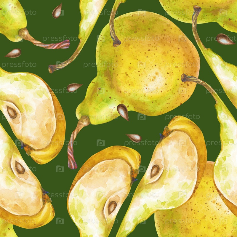 Бесшовный рисунок ручно нарисованных целых грушей и кусков фруктов на зеленом фоне. Иллюстрация акварели. Ботанический шаблон для упаковки, обоев и текстиля