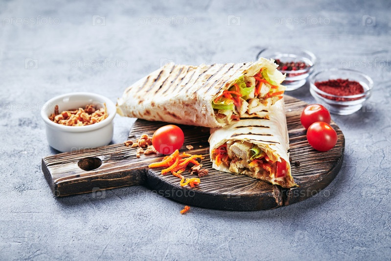 Традиционная восточная шарма с курицей и овощами, доннер-кебаб со соусами на деревянной доске