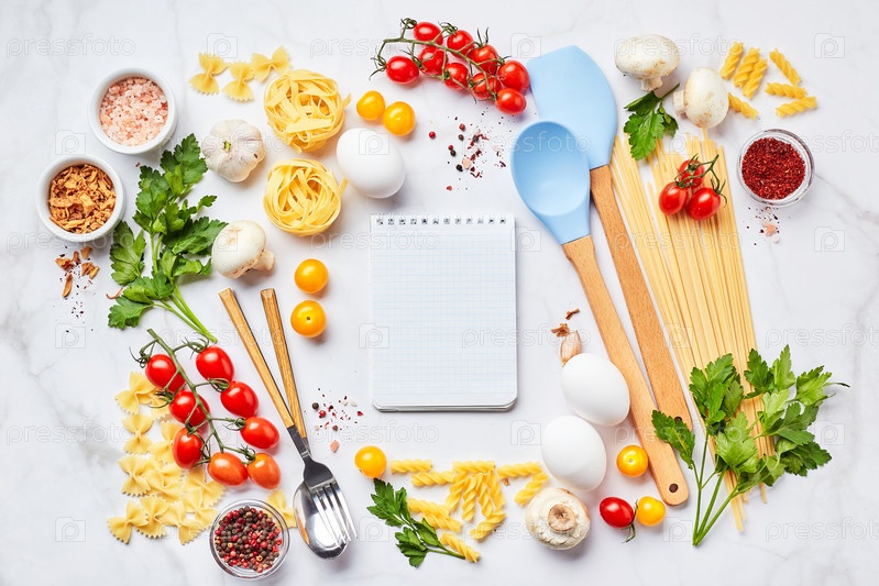 Фон приготовления макаронных изделий с блокнотом для текста, помидоры, травы, грибы, яйца разбросаны на светлом мраморном фоне, вид сверху