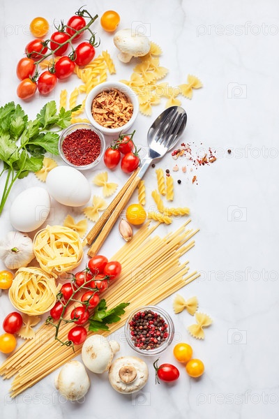 Пищевой фон с различными видами макаронных изделий, помидоров, трав, грибов, яиц, приправ разбросаны на светлом мраморном фоне, вид сверху