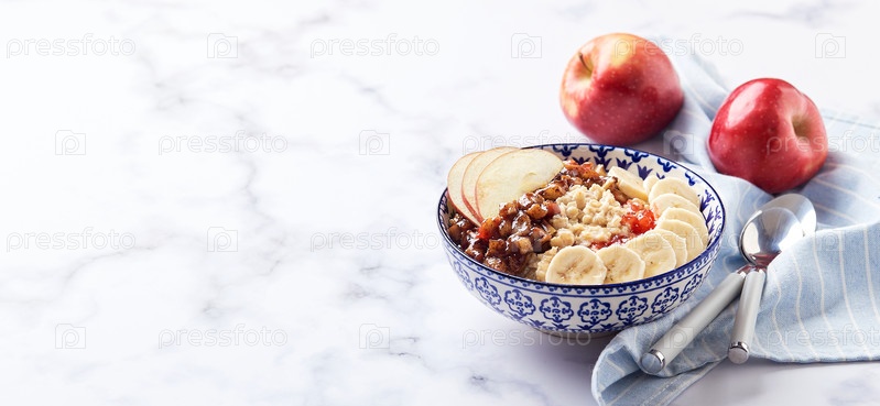 Овсянка с карамельными яблоками с корицей, бананом и измельченной клубникой