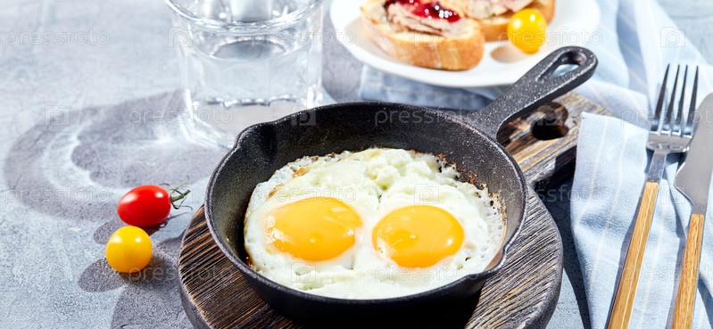 Жареные яйца в чугунных сковородках. солнечный утренний завтрак