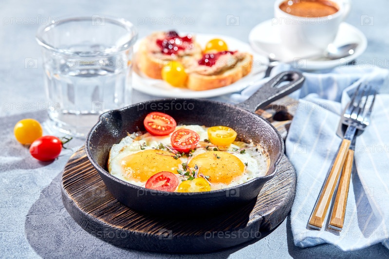 Жареные яйца в чугунных сковородках. солнечный утренний завтрак