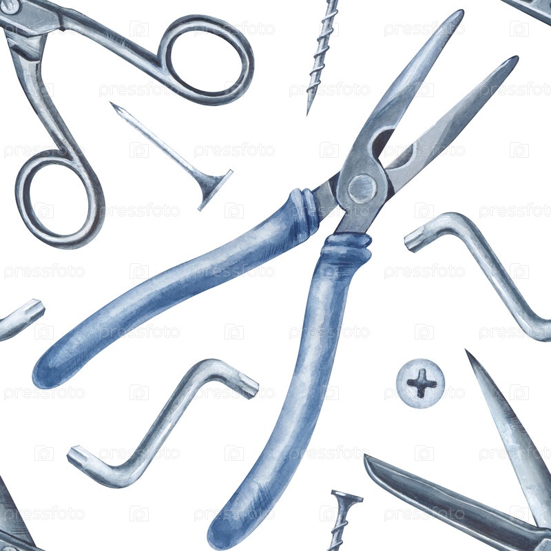 Бесшовный акварельный рисунок с мужскими инструментами выполнен вручную. железные ножницы, клещи, гвозди и винты на белом фоне. ремонт дома, сервис по ремонту