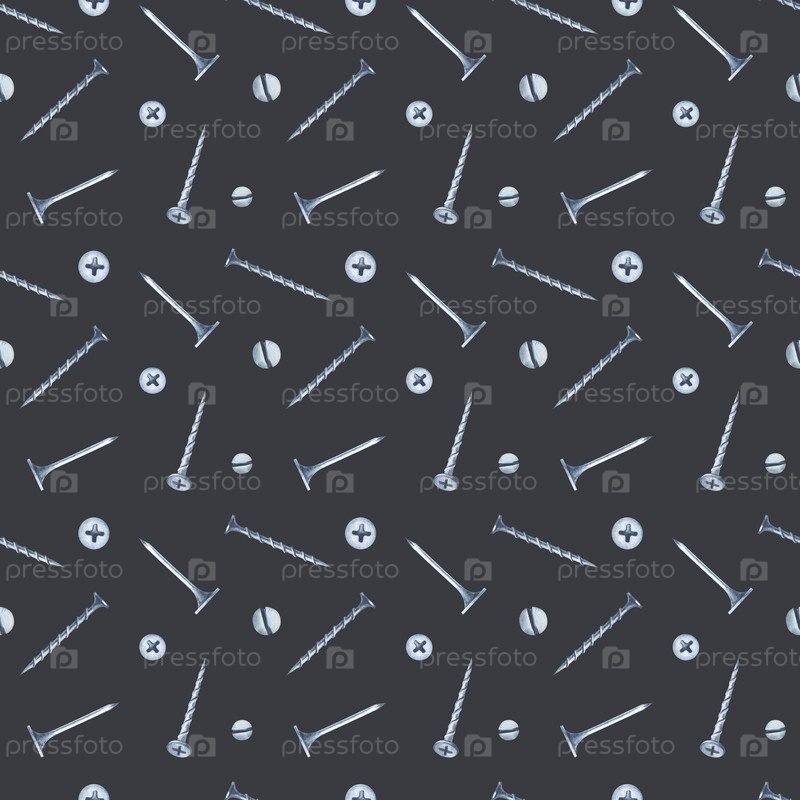 Бесшовный рисунок с гвоздями и винтами на тёмно-сером фоне нарисован вручную. Иллюстрация акварели. Идеально подходит для упаковки, обоев, оберточной бумаги