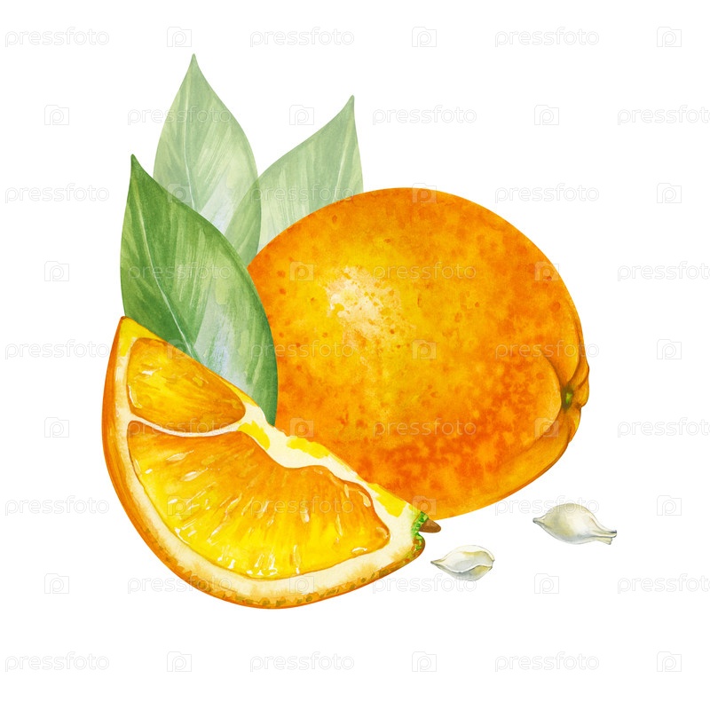 Композиция с апельсинами рисуется вручную. Иллюстрация акварели. Целые фрукты, кусочек апельсина, зеленые листья и семена выделяются на белом фоне. Клипарт для упаковки, текстиля, сока, скрапбукинга и печатных изделий