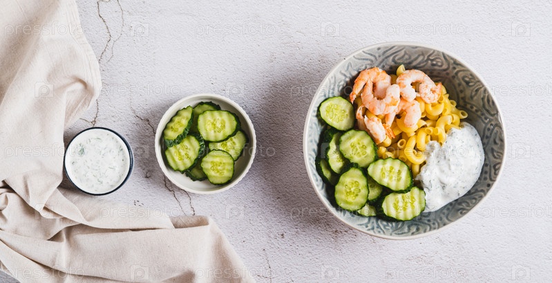Паста с креветками, свежим огурцом и сливочным соусом в миске с веб-баннером для верхнего просмотра