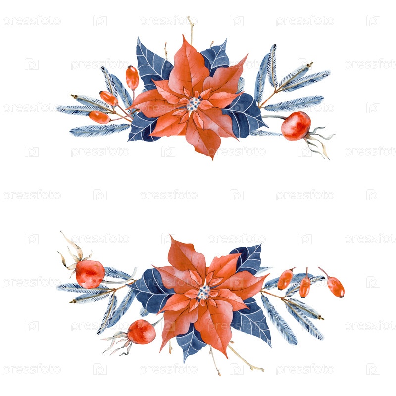 Ручно нарисованная рама из цветов поинсетсии, ветвей рождественской елки и розовых бедер. Иллюстрация акварели на белом фоне. Рождественский рисунок с красными цветами для открыток, упаковки, приглашений, блюд